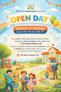 Martedì 20 gennaio dalle ore 16 alle ore 17 si svolgerà l'open day della scuola primaria del plesso della Cunetta nello stabile sito in via Mauro manca 1B, genitori e bambini interessati sono invitati a venire a visitare gli ambineti della nostra scuola e conoscer i nostri insegnanti.