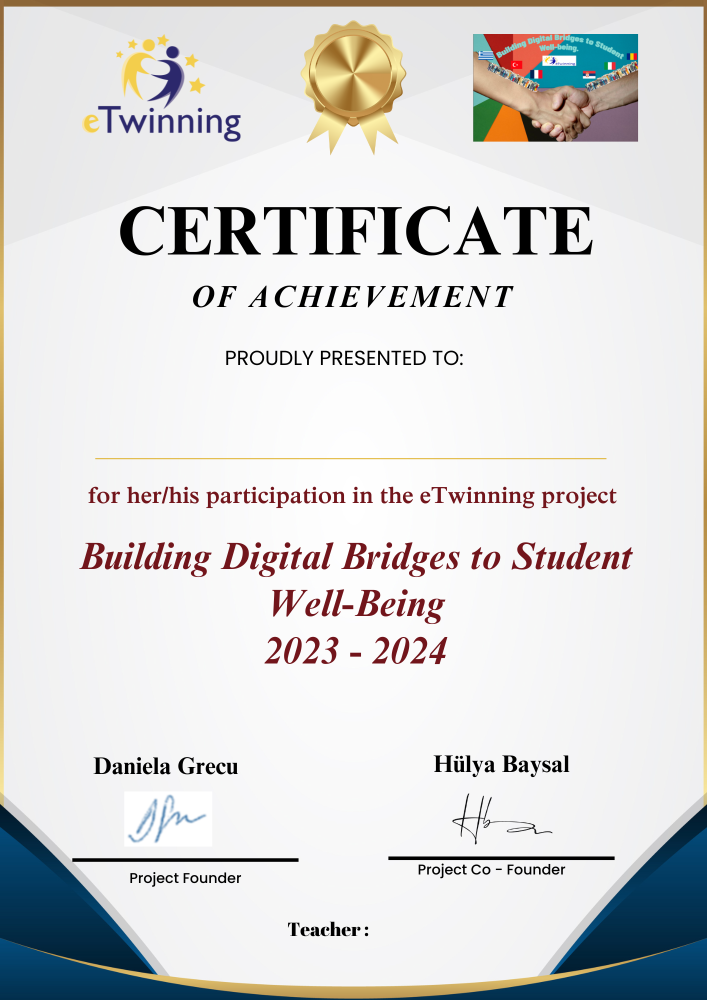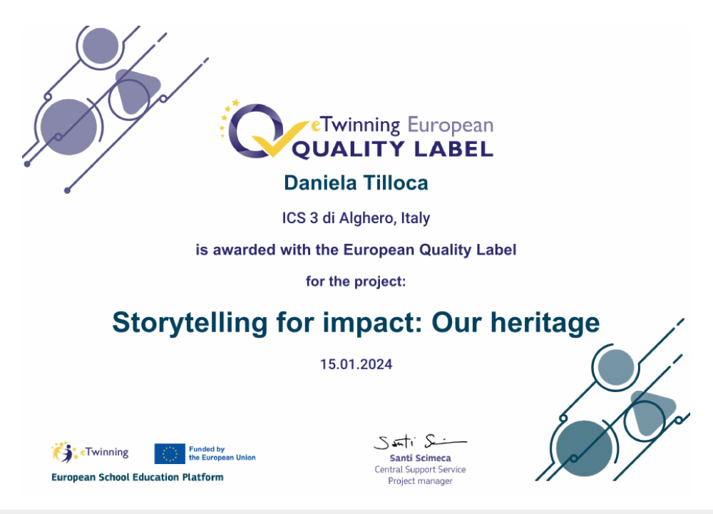 Nel corso dell’anno scolastico 2023-2024 le classi terza B e terza C della Scuola Secondaria dell’Istituto Comprensivo 3 di Alghero hanno partecipato al progetto internazionale eTwinning “Building Digital Bridges to Student Well-being”. Il progetto ha visto coinvolte insegnanti e scuole di varie nazioni europee tra cui Romania, Grecia, Turchia, Croazia, Polonia, Moldavia e Serbia, ed è stato approvato dall’Unità Nazionale dei rispettivi Paesi, comprese quelle Italiana ed Europea. Il progetto è collocato all'interno del programma d'istituto " eTtwinning tutto l'anno", che prevede il gemellaggio elettronico tra scuole europee attraverso la collaborazione e il coinvolgimento in progetti che promuovono l’innovazione, l’utilizzo delle tecnologie nella didattica, il potenziamento delle lingue straniere. Il progetto ha avuto lo scopo di riunire studenti e insegnanti da diversi Paesi per promuovere il benessere degli studenti e sviluppare solide connessioni digitali, con l’approfondimento di tematiche quali la tolleranza, la tutela dell’ambiente, l’alimentazione sana, l’espressione creativa dei sentimenti. Di seguito sono allegati il logo del progetto e i certificati di qualità consegnati agli studenti e alle docenti promotrici del progetti Giusy Pascalis e Daniela Tilloca. Questo è il link alla presentazione del progetto.